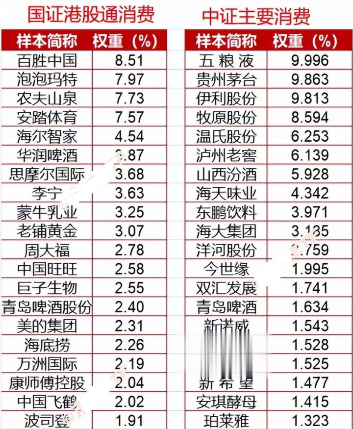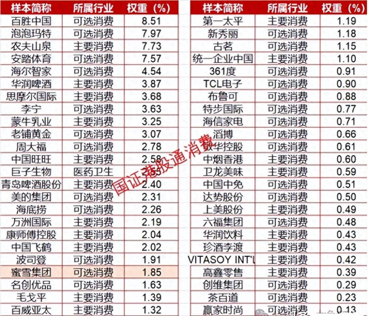 那么与国内的主要消费指数对比又如何呢?我们拿比较有代表性的汇添富消费ETF(15**28)来对比一下:该ETF的权重主要集中在白酒、乳业和养殖领域,和港股通消费50其实不构成竞争关系,反而是传统消费和新消费的互补。
